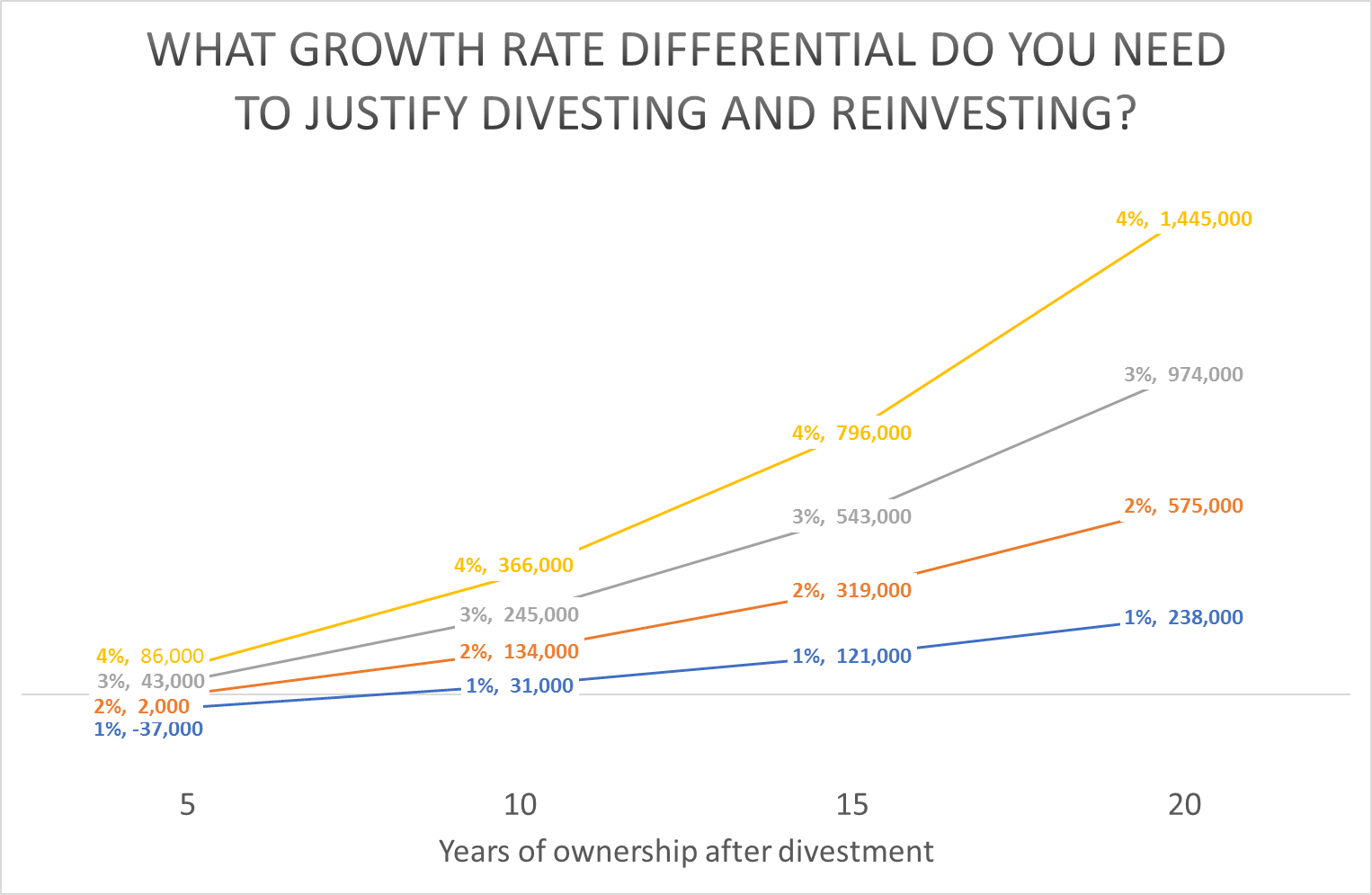 The chart projects the difference in overall wealth in today’s dollars (i.e. excluding inflation) after 5, 10, 15 and 20 years. It measures the impact of a 1%, 2%, 3% and 4% annual growth rate differential. That is, what if the replacement property appreciates at 1% + 5.8% = 6.8%, or 2% + 5.8% = 7.8% p.a. and so on. For example, if this investor divests of their existing asset and invests in a replacement property that grows at 7.8% p.a., after 15 years the investor will be $319,000 better off (net of all costs) in today’s dollars.